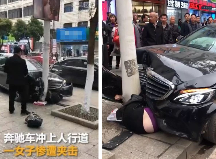 不少行人正在人行道上行走,一輛黑色奔馳車突然躥到人行道上撞倒一名女性行人,隨后撞上路燈桿才停下來。